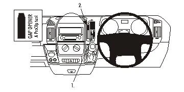 Use the enclosed alcohol pad to clean the area where the ProClip is to be installed. Peel off the adhesive tape covers on the ProClip. Press the angled edge on the right part of the ProClip into the gap between the frame surrounding the air vent and the dashboard.