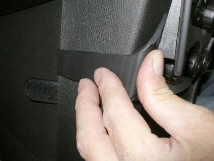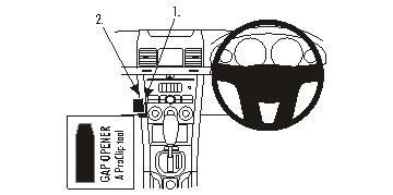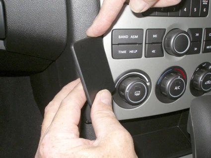 Use the enclosed alcohol pad to clean the area where the ProClip is to be installed. Press the thin end of the enclosed gap opener into the gap in the center console side wall, to widen the gap. Peel off the cover of the adhesive tape on the ProClip. Press the curved edge on the right part of the ProClip into the gap between the control panel and the surrounding frame.