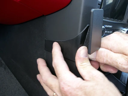 Keep the ProClip in that position and press forward on the ProClip so the angled edge on the left part hooks into the center console side wall.