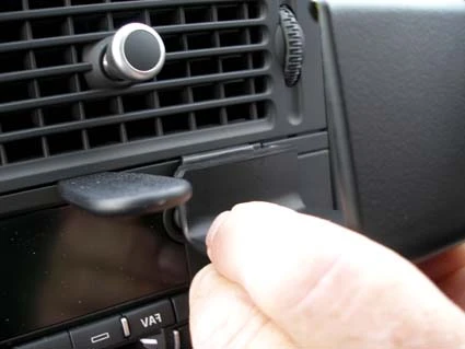 Press the thin end of the enclosed gap opener into the gap between the frame surrounding the air vent and the control panel, to widen the gap. Peel off the cover of the adhesive tape on the ProClip. Press the curved edge on the lower part of the ProClip into the gap next to the gap opener.