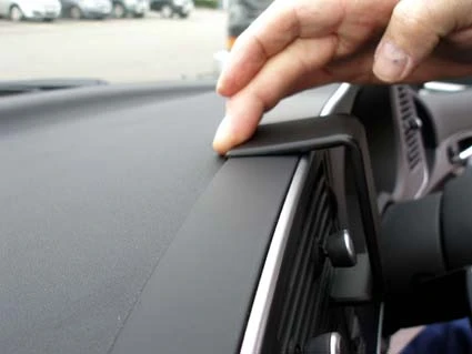 Hook the angled edge on the upper part of the ProClip over the edge of the dashboard. Press downward on top of the ProClip so the angled edge hooks properly into place and the adhesive tape attaches. Pull out the gap opener.