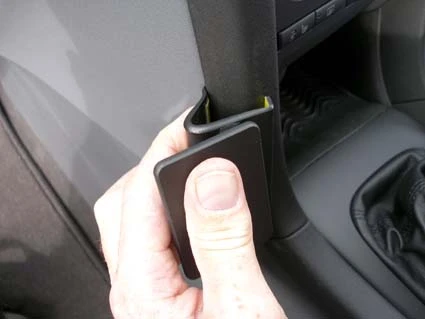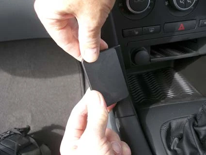 Peel off the adhesive tape covers on the ProClip. Press the angled edge on the left part of the ProClip into the gap between the frame surrounding the control panel and the dashboard.