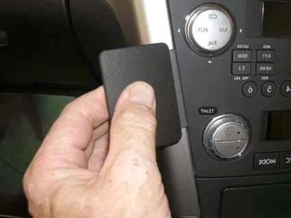 Peel off the adhesive tape covers on the ProClip. Hook the angled edge on the left part of the ProClip into the gap between the frame surrounding the control panel and the dashboard.