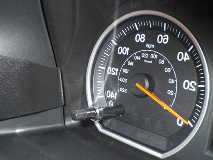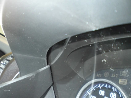 Use the enclosed alcohol pad to clean the area where the ProClip is to be installed. Peel off the cover of adhesive tape on the ProClip. Press the curved edge on the right side of the ProClip into the gap between the instrument window and the surrounding panel frame, towards the upper corner.