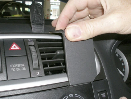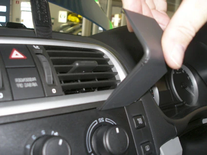 Press the curved edge on the lower part of the ProClip into the gap between the climate control panel and the surrounding frame. Flip the ProClip upwards/fowards so the curved lower edge hooks behind the climate control panel.