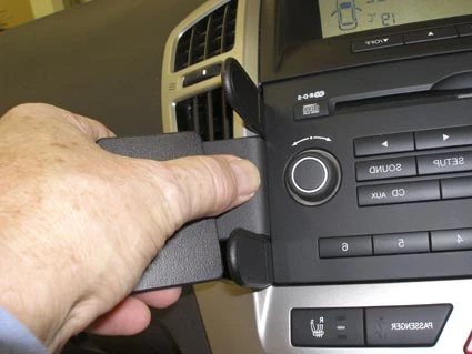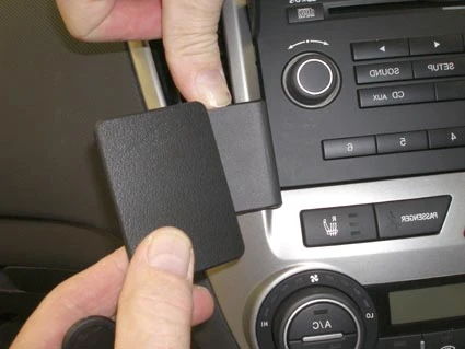 Press the thin end of the enclosed gap openers into the gap between the stereo and the surrounding frame, to widen the gap. Peel off the adhesive tape cover on the ProClip. Press the grooved edge on the right part of the ProClip into the gap between the gap openers.