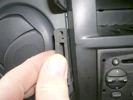 Press the thin end of the enclosed gap openers into the gap between the frame surrounding the control panel and the panel surrounding the air vent, to widen the gap. Peel off the adhesive tape cover on Part 1. Press the angled edge on Part 1 into the gap between the gap openers. Press Part 1 leftward/forward and slide it downward in the gap until it stops.