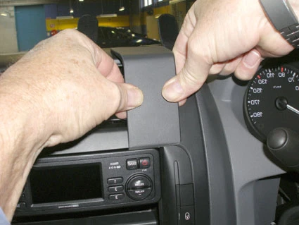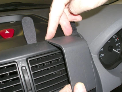 Pull the ProClip downward and press the lower part foward so the angled edge hooks into the gap between the frame surrounding the stereo and the frame surrounding the air vent. Pull out the gap openers.