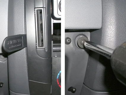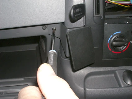 Open the glove compartment. Remove the screw in the upper right corner. Press the thin end of the enclosed gap opener into the gap between the frame surrounding the control panel and the dashboard, to widen the gap. Peel off the cover of the adhesive tape on the ProClip.