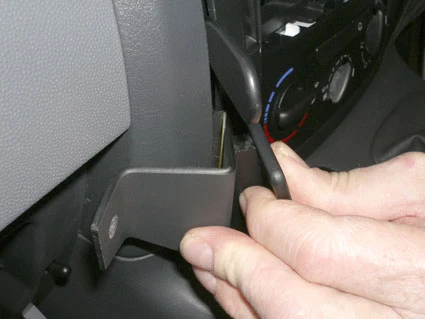 Press the curved edge on the right part of the ProClip into the gap below the gap opener. Flip the ProClip forward/leftward so the curved right edge hooks behind the frame surrounding the control panel