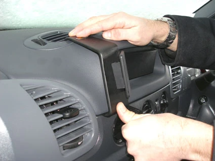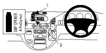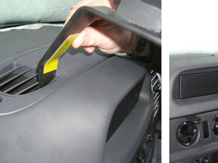 Press the thin end of the enclosed gap opener into the gap between the dashboard and the control panel. Peel off both adhesive tape covers on the ProClip. Place the upper part of the ProClip, with angle, into the lower part of the air vent.