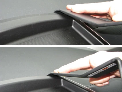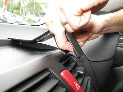 Use the enlcosed alcohol pad to clean the area where the ProClip is to be installed. Peel off the adheisve tape covers on the ProClip. Place the angled edge on the upper part of the ProClip onto the dashboard next to the center console. Press down on top of the ProClip, in the same time pull it toward you so the angled upper edge hooks into the gap between the dashboard and the center console.