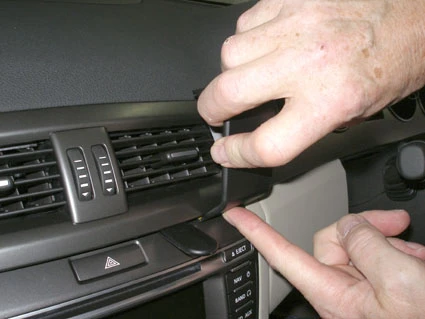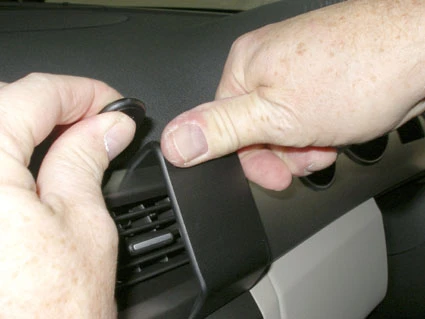 Press the gap opener into the gap between the frame surrounding the air vent and the dashboard. Press forward on the upper part of the ProClip so the grooved edge goes into the gap next to the gap opener. Press until you hear/feel it snaps into place. Pull out the gap opener.
