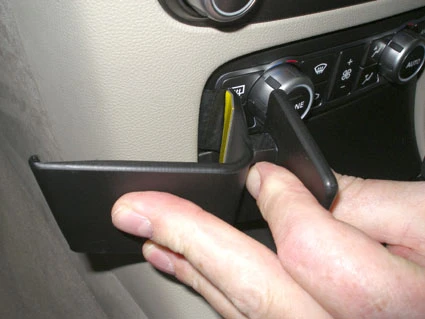 Peel off the adhesive tape covers on the ProClip. Press the angled edge on the right part of the ProClip into the gap between the climate control panel and the surrounding frame.
