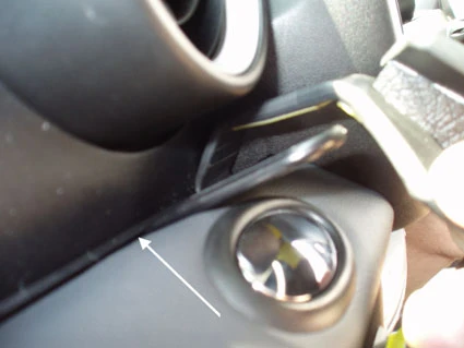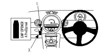 Open the top compartment next to the left air vent. Press the thin end of the enclosed gap opener into the gap between the dashboard ledge and the panel frame below the air vent, to widen it. (See arrow in image). Peel off the cover of adhesive tape on the ProClip. Press the curved edge on the upper part of the ProClip into the gap next to the gap opener. Press until you see or hear/feel it snaps into place.
