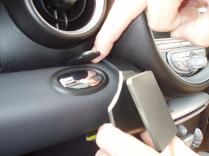 Press firmly forward on the lower part of the ProClip so the angled edge hooks around the dashboard edge by the glove compartment. Close the glove compartment and the top compartment. Pull out the gap opener.