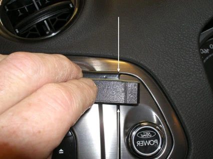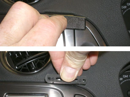 Press the angled edge on Part 1 into the gap between the frame surrounding the control panel and the dashboard. Press Part 1 forward/upward so the angled edge hooks behind the frame surrounding the control panel and the adhesive tape attaches to the dashboard.