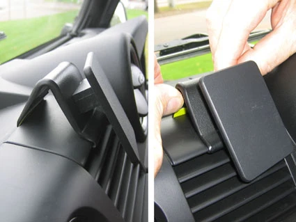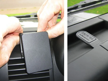 Press the thin end of the enclosed gap opener into the gap between the coin compartment and the dashboard, to widen the gap. Peel off the adhesive tape covers on the ProClip. Hook the angled edge in the lower part of the ProClip under the upper edge of the air vent housing.