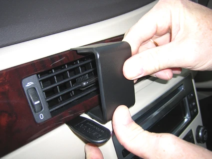 Press the thin end of the enclosed gap opener into the gap between the frame surrounding the air vent and the dashboard, to widen the gap. Press the grooved edge on the lower part of the ProClip into the gap next to the gap opener. Press until you hear/feel it snaps into place. Pull out the gap opener.