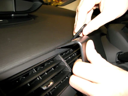 Hook the lower part of the ProClip under the air vent frame. Press forward on the lower part of the ProClip so it hooks into place properly. Pull out the gap opener.