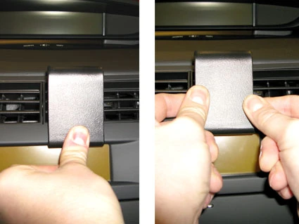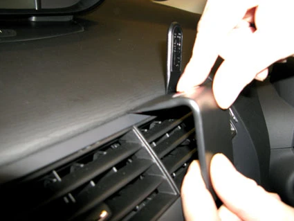 Press the thin end of the enclosed gap opener into the gap between the air vent frame and the dashboard, to widen the gap. Peel off the adhesive tape covers on the ProClip. Press the angled edge on the upper part of the ProClip into the gap next to the gap opener.