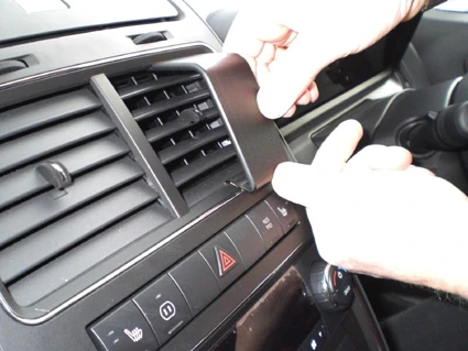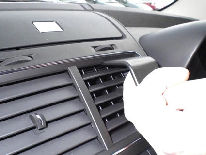 Press upward and forward on the lower part of the ProClip so the angled edge hooks into the gap/seem between the air vent and the air vent edge.
