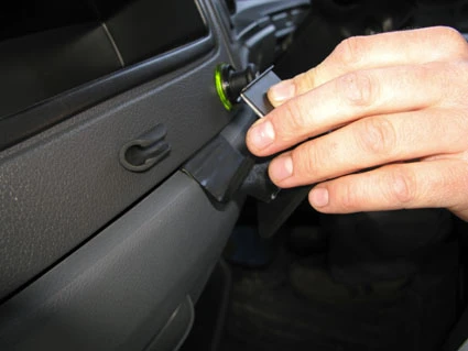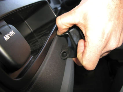 Peel off the adhesive tape cover on the ProClip. Press the angled edge on the lower part of the ProClip into the gap between the frame surrounding the control panel and the dashboard. Press the ProClip forward/upward so the angled edge hooks behind the dashboard.