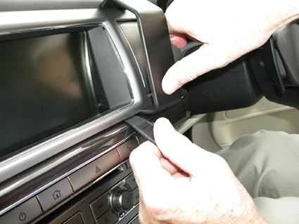 Press the thin end of the enclosed gap opener into the gap between the panel frame surrounding the information screen and the dashboard ledge, to widen the gap. Press down on the thick end of the gap opener to widen the gap even more. Keep the gap opener in this position and press the grooved edge on the lower part of the ProClip into the gap next to the gap opener.