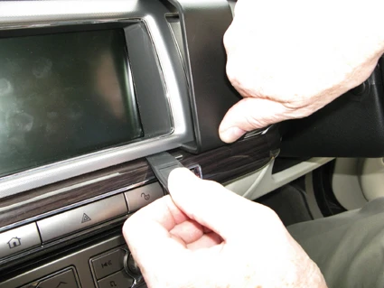 Press the gap opener into the gap between the panel frame surrounding the information screen and the dashboard. Press firmly forward on the upper part of the ProClip so the grooved edge goes into the gap next to the gap opener. Press until you see or hear/feel it click into place. Pull out gap opener.