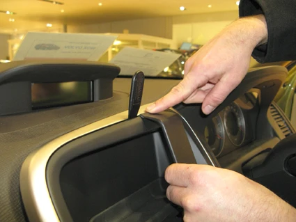 Use the enclosed alcohol pad to clean the area where the ProClip is to be installed. Press the thin end of the enclosed gap opener into the gap between the frame surrounding the display and the frame surrounding the center console. Peel off the adhesive tape cover on the ProClip. Hook the angled edge on the upper part of the ProClip into the gap next to the gap opener and press it all the way into the gap. Pull out the gap opener.