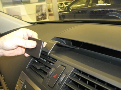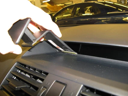 Use the enclosed alcohol pad to clean the area where the ProClip is to be installed. Peel off the adhesive tape covers on the ProClip. Press the curved edge on the upper part of the ProClip into the gap between the frame surrounding the display and the dashboard, to widen the gap.