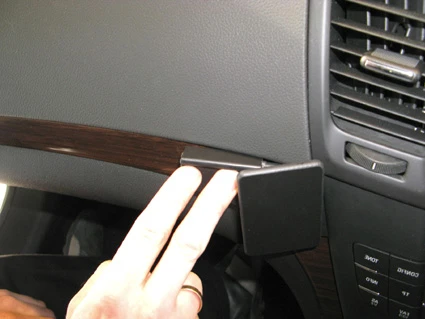 Press forward on the left side of the ProClip so the grooved edge goes into the gap between the dashboard and the trim. Press until you hear/feel it snaps into place.