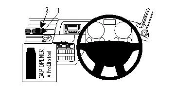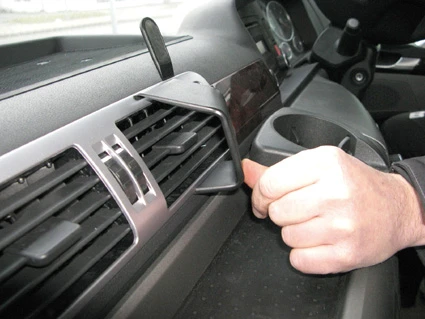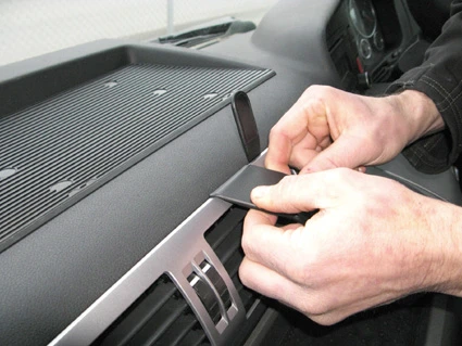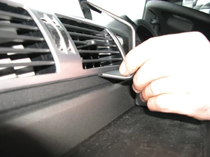 Press the thin end of the enclosed gap opener into the gap between the frame surrounding the air vent and the dashboard, to widen the gap. Press the grooved edge on the lower part of the ProClip into the gap between the frame surrounding the air vent and the dashboard.