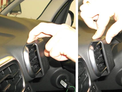 Hook the angled edge on the upper part of the ProClip into the gap between the frame surrounding the air vent and the dashboard. Press down on top of the ProClip so the angled edge goes all the way into the gap.