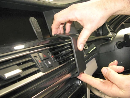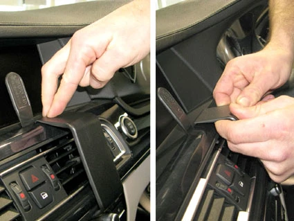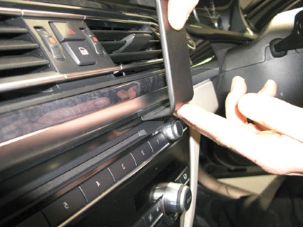Use the enclosed alcohol pad to clean the area where the ProClip is to be installed. Press the thin end of the enclosed gap opener into the gap between the trim and the panel surrounding the display, to widen the gap. Peel off the adhesive tape cover on the ProClip. Press the angled edge on the lower part of the ProClip into the gap between the control panel and the surrounding frame.