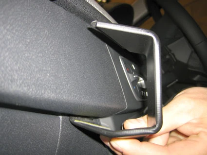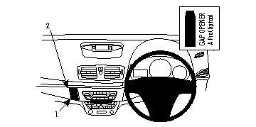 Use the enclosed alcohol pad to clean the area where the ProClip is to be installed. Press the thin end of the enclosed gap opener into the gap between the upper and lower section of the dashboard. Peel off the adhesive tape cover on the ProClip. Press the angled edge on the lower part of the ProClip into the gap between the panel and the dashboard overhang.