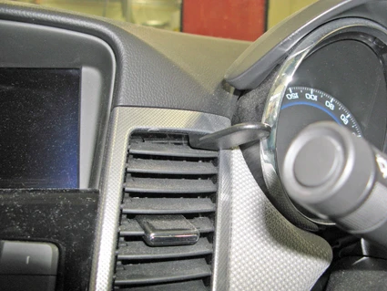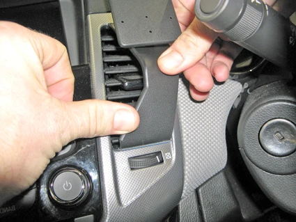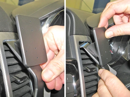 Press upward on the lower part of the ProClip so it flexes up. Push forward so the curved edge goes into the air vent. Let go of the pressure on the ProClip so the curved edge goes into the gap between air vent and the surrounding panel frame.