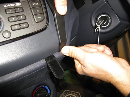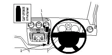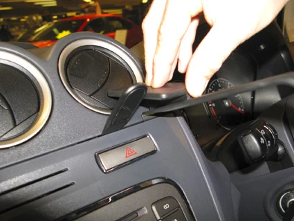 Press the gap opener into the gap between the center panel and the console. Hook the angled edge on the lower part of the ProClip into the gap next to the gap opener. Press forward on the lower part of the ProClip so the angled edge goes all the way into the gap. Pull out the gap opener.
