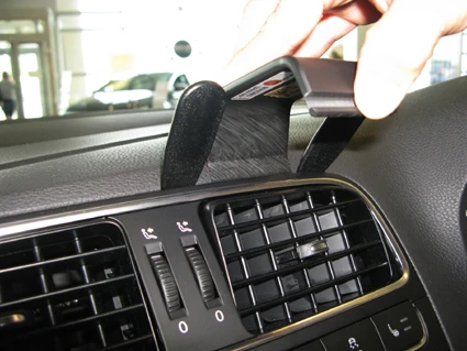 Flip the ProClip downward so the upper angled edge hooks behind the dashboard. Press the lower part of the ProClip upward and hook the grooved edge into the lower part of the air vent.
