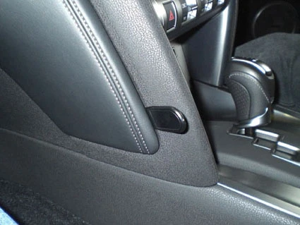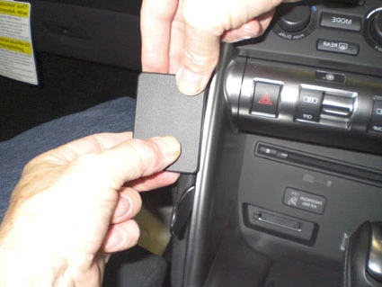 Use the enclosed alcohol pad to clean the area where the ProClip is to be installed. Press the thin end of the enclosed gap opener into the gap between the center console edge and the padded part of the sidewall, to widen the gap. Peel off the cover of adhesive tape on the ProClip.
