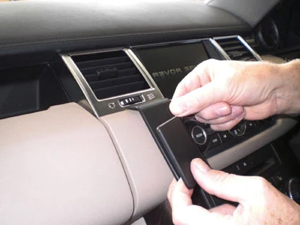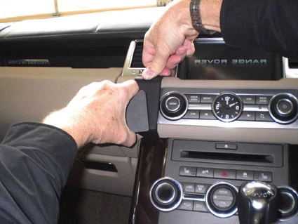 Press down on top of the ProClip so it flexes downwards and then hook the angled edge into the gap between the padded dashboard overhang and the center console panel.
