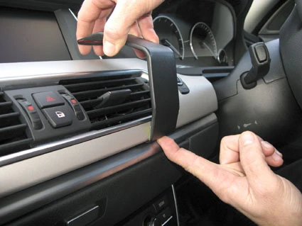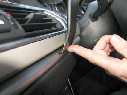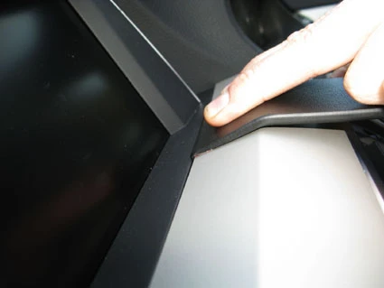 Hook the angled edge on the upper part of the ProClip into the gap between the panel surrounding the information window and the dashboard. Press down on top of the ProClip so the angled edge goes all the way into the gap.