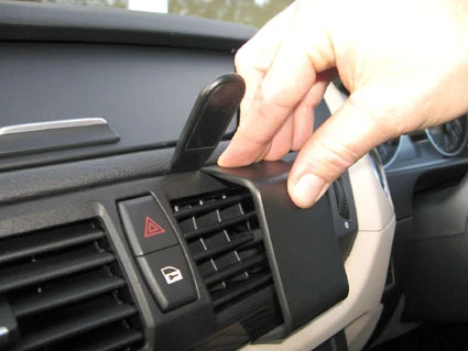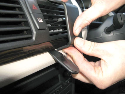 Use the enclosed alcohol pad to clean the area where the ProClip is to be installed. Press the thin end of the enclosed gap opener into the gap between the panel surrounding the air vent and the dashboard, to widen the gap. Peel off the adhesive tape covers on the ProClip. Press the angled edge on the lower part of the ProClip into the gap next to the gap opener. Pull out the gap opener.