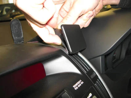 Use the enclosed alcohol pad to clean the area where the ProClip is to be installed. Press the thin end of the enclosed gap opener into the gap between the center console and the dashboard, to widen the gap. Peel off the adhesive tape covers on the ProClip. Press the left corner of the upper part of the ProClip into the gap next to the gap opener.