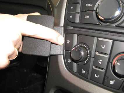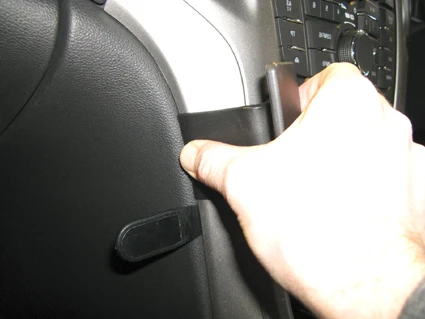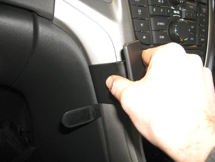 Use the enclosed alcohol pad to clean the area where the ProClip is to be installed. Press the thin end of the enclosed gap opener into the gap in the center console sidewall, to widen the gap. Peel off the adheisve tape cover on the ProClip. Press the angled edge on the right part of the ProClip into the gap between the climate control panel and the surrounding frame.