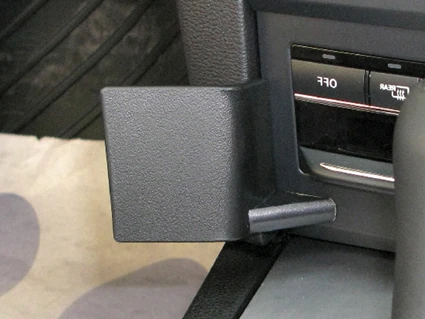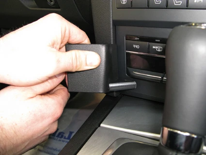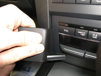 Use the enclosed alcohol pad to clean the area where the ProClip is to be installed. Peel off the adhesive tape cover on the ProClip. Press the upper corner of the grooved edge on the ProClip into the gap between the control panel and the dashboard.