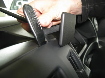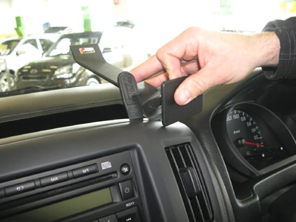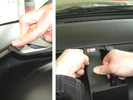 Press the gap opener into the gap between the coin compartment and the dashboard. Press the upper part of the ProClip forward/downward so the angled edge hooks into the gap next to the gap opener. Pull out the gap opener. Press dorn on top of the ProClip so the angled edge goes all the way into the gap.