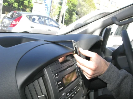 Use the enclosed alcohol pad to clean the area where the ProClip is to be installed. Peel off the adhesive tape covers on the ProClip. Press the curved edge on the upper part of the ProClip into the gap between the coin compartment and the dashboard.