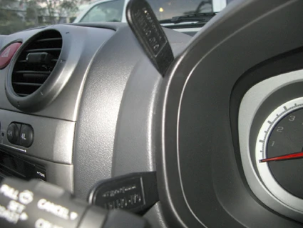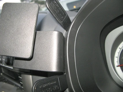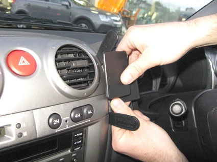 Press the gap openers into the gap between the center console and the dashboard. Press the ProClip firmly to the left and forward so the angled left edge goes into the gap between the gap openers. Pull out the gap openers.