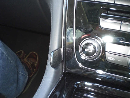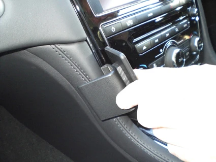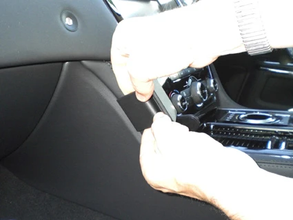 Press the thin curved edge on the right side of the ProClip into the gap above the gap opener. Then flip it to the left so the curved edge hooks behind the center console panel.
